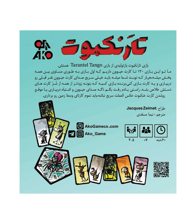 بازی فکری تارنکبوت یک بازی کارتی وسرعت عملی است که برگردانی از بازی خارجی Tarantel Tango میباشد. توی این بازی سرعتی قراره کلی بخندین. چون هر بازیکن توی نوبتش باید صدای حیوون کارت قبلی رو دربیاره و یه کارت بازی کنه. هرکی هم که اشتباه این کار رو انجام بده جریمه میشه.