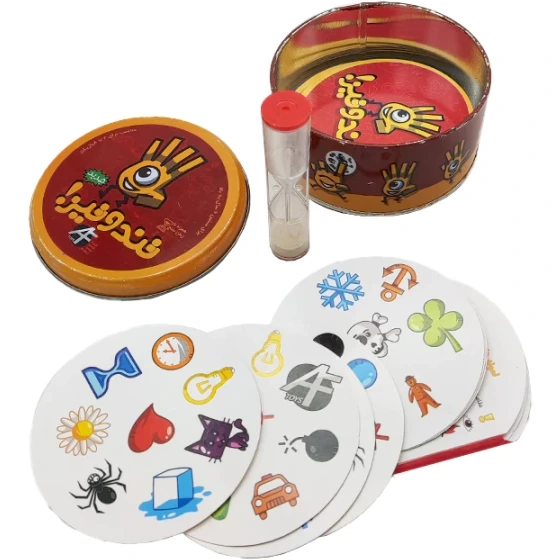 این محصول شامل 55 کارت بازی یک عدد ساعت شنی و کارتهای راهنمای بازی است که داخل یک جعبه دایره ای شکل فلزی قرار دارد.